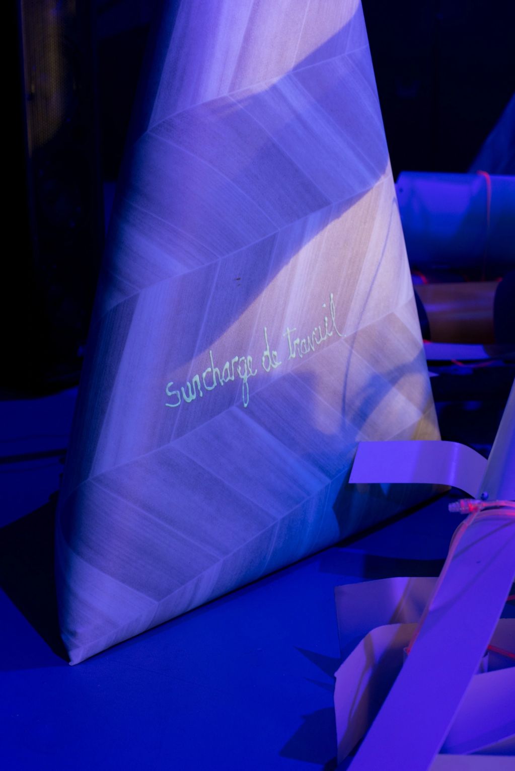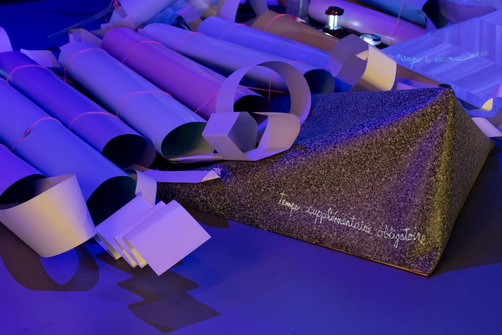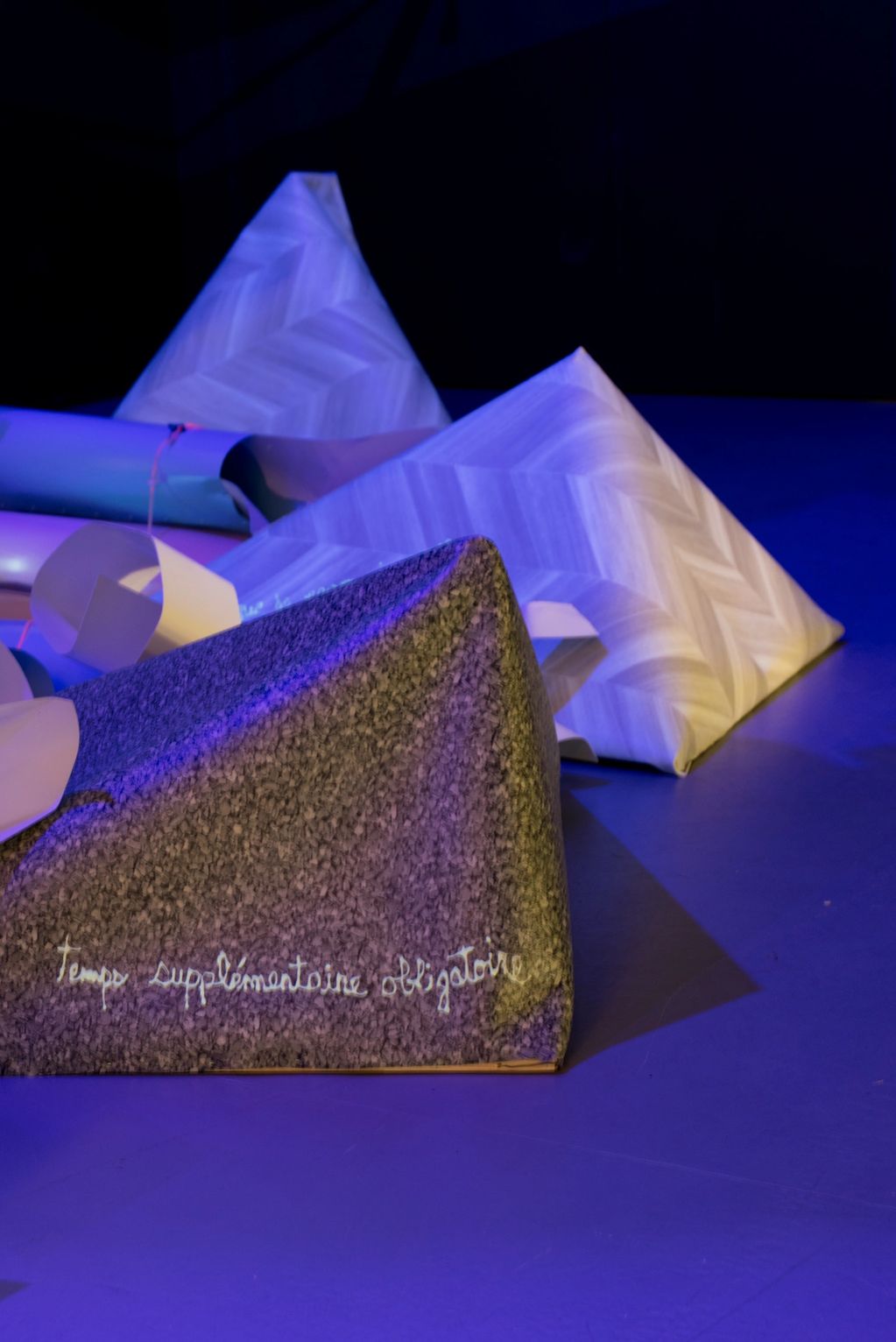 Les rochers en prélart rappellent le plancher sans repos des soignants, qu’ils arpentent jusqu’à l’épuisement. Sur l’un d’eux, l’inscription « temps supplémentaire obligatoire » pèse comme une prière.