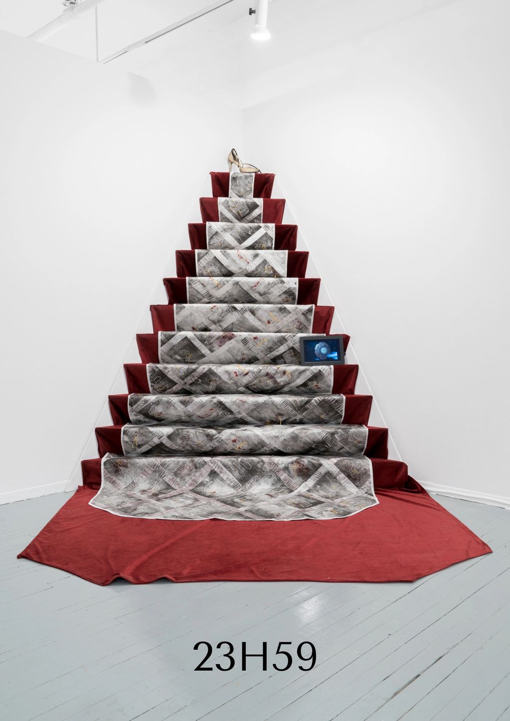 Sewn assemblage of mokulithograph prints on Mulberry paper, set on red velvet steps. A screen plays an animation of ball shoes through time. Th