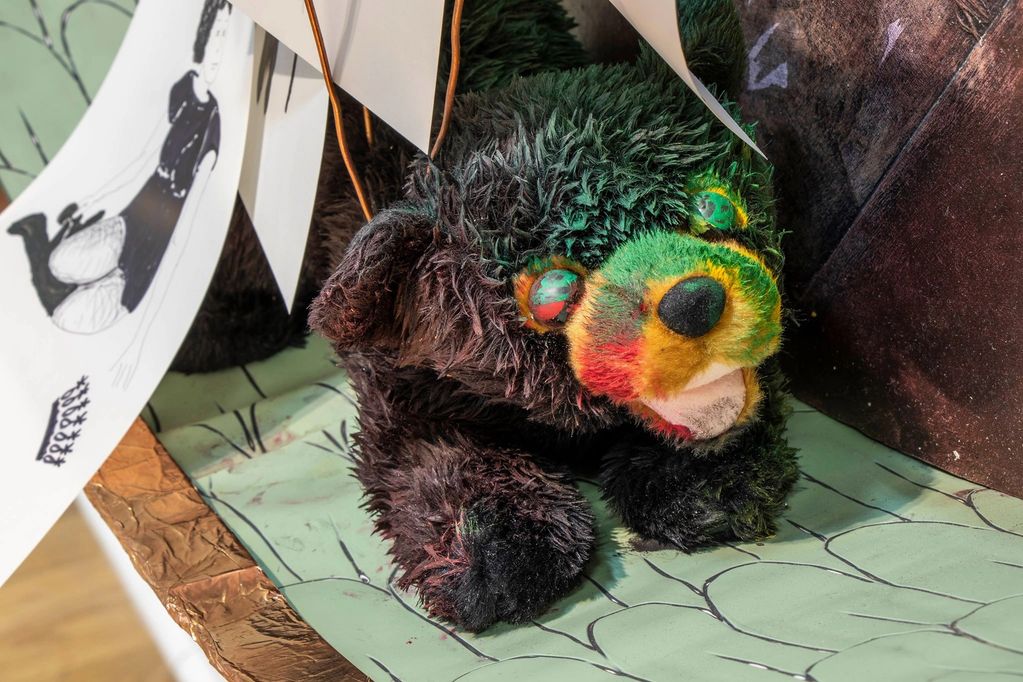 The linocut matrix, polyester plates, and copper threads form a circular, mobile structure, sheltering the bear that was used for printing.