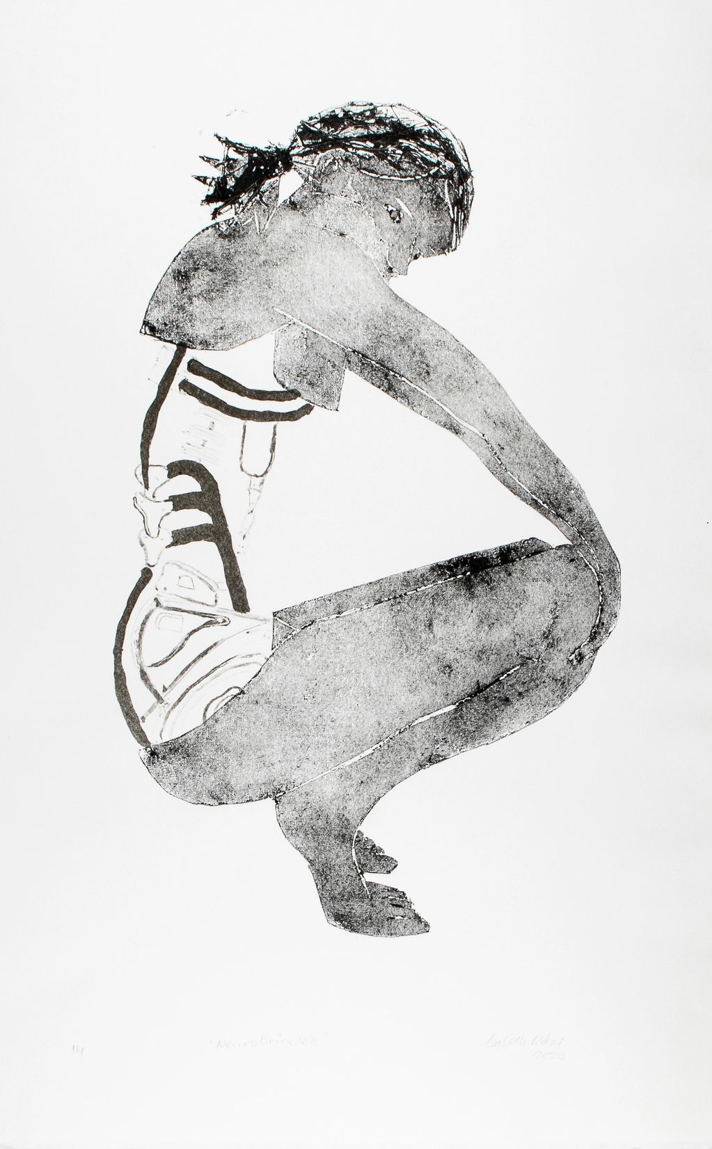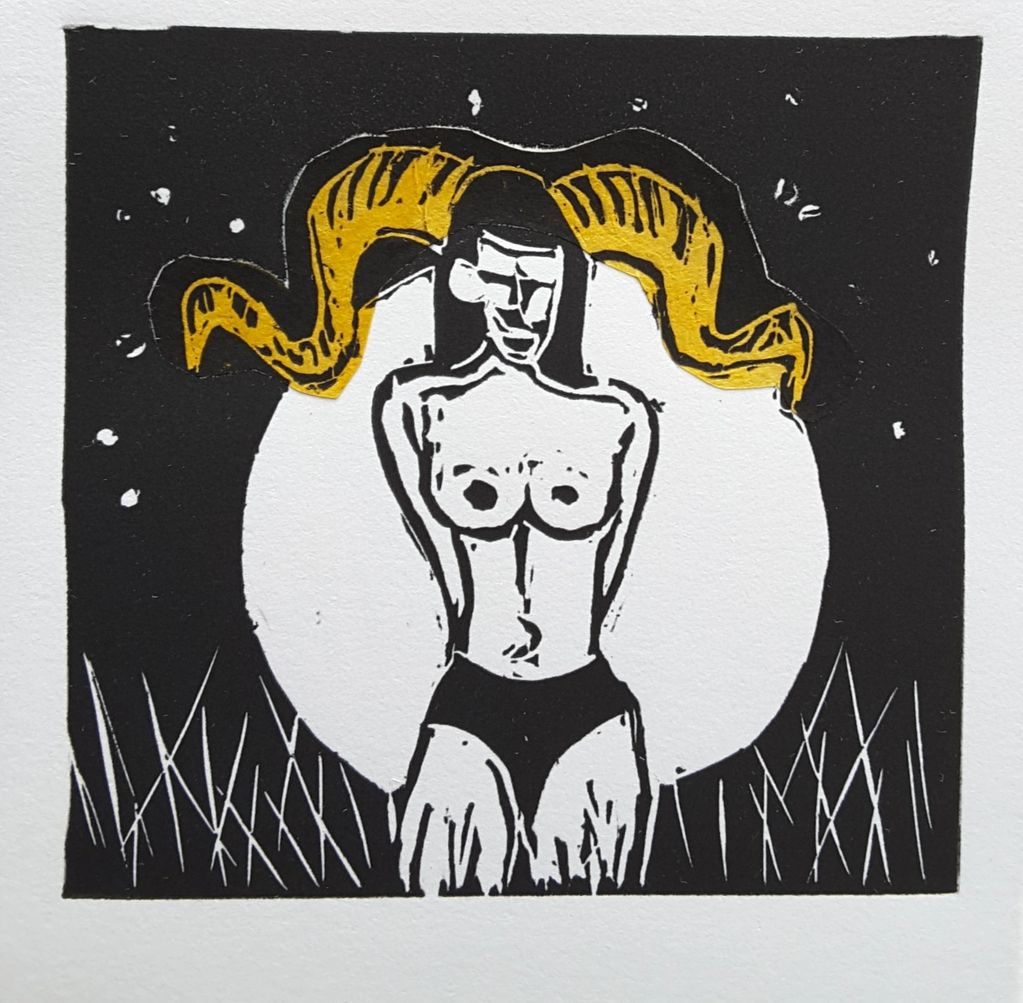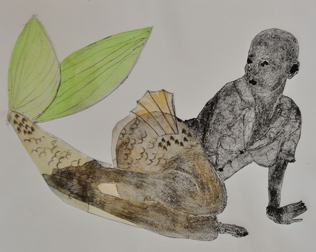 – Collagraph and drypoint on paper (20 × 25 cm, 2021). Like Melusine, this print explores the boundary between human and mythical. Two plates convey her duality: one