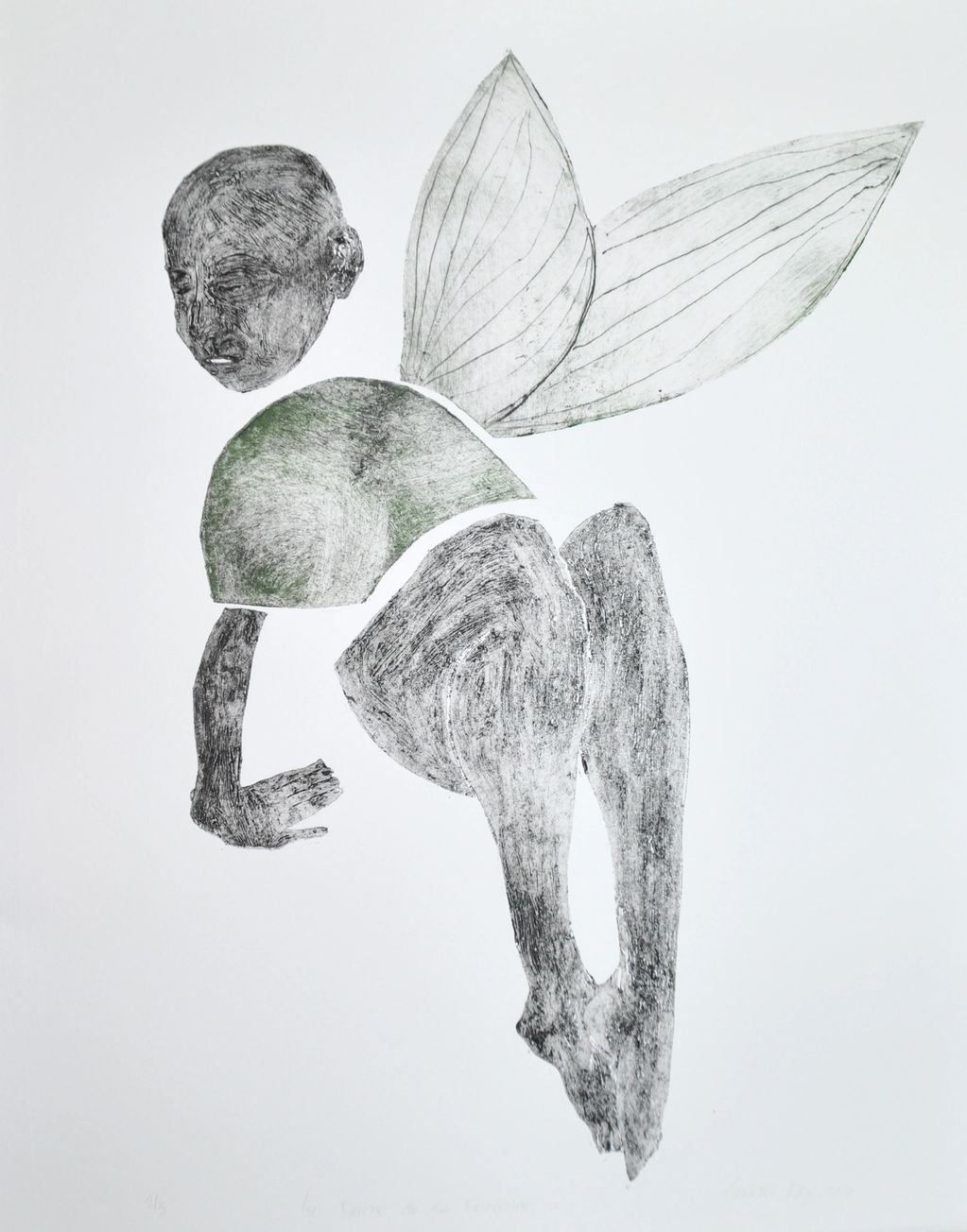 – Collagraphie et pointe sèche (40 × 50 cm, 2021). Voici Mélusine assise au bord de la fontaine, entre humaine et métamorphose féerique. L’estampe unit textures organiques et ailes translucides, évoquant le seuil entre mythe et réalité.