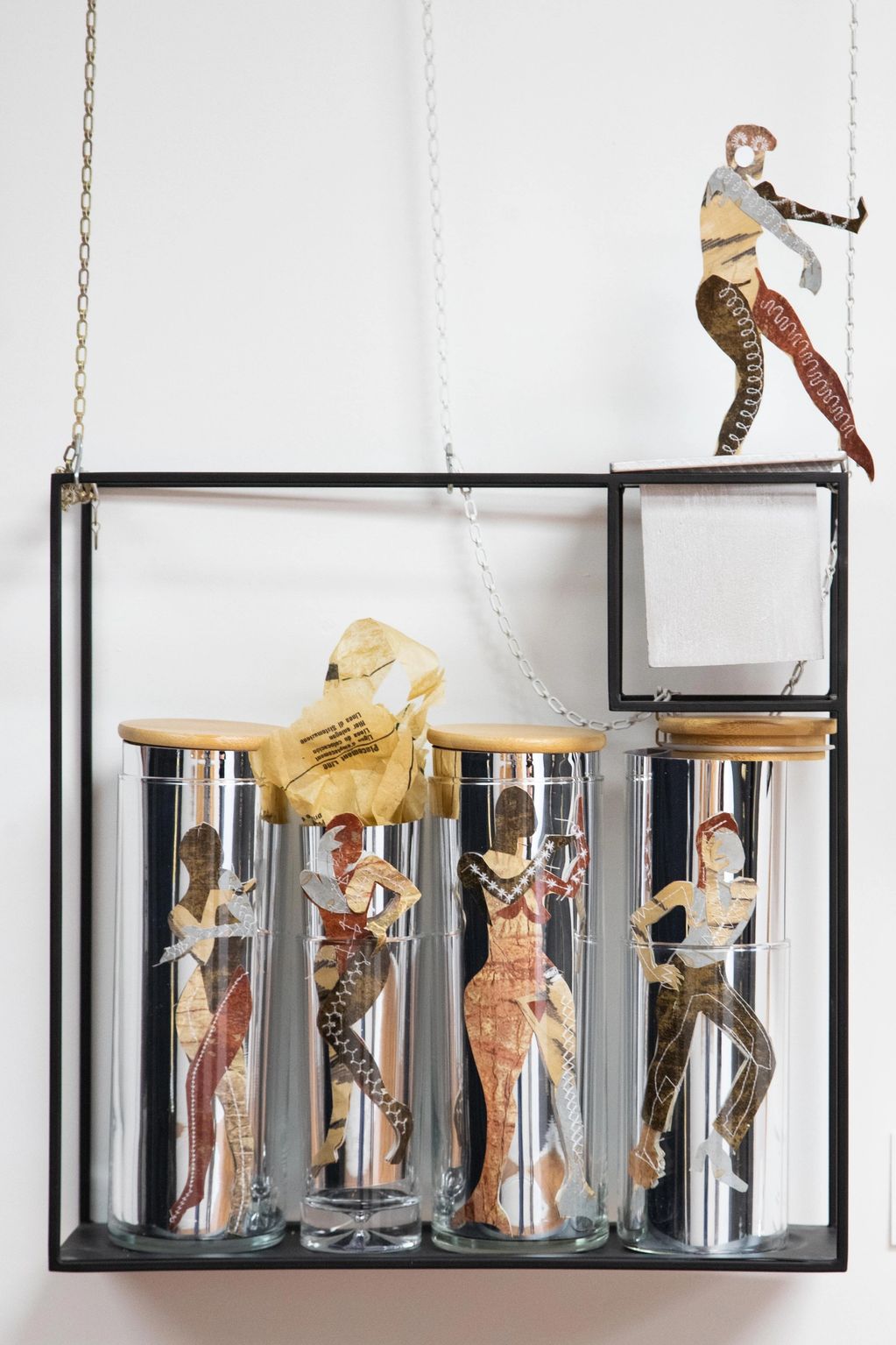 La structure circulaire, montée sur un socle rotatif, évoque la fluidité du mouvement. Les figures sur polyester glissent le long des fils de cuivre, animant la pièce d’un souffle intérieur.