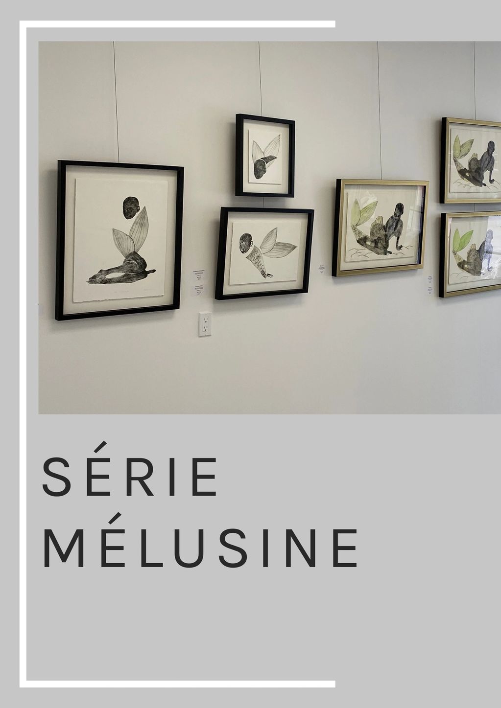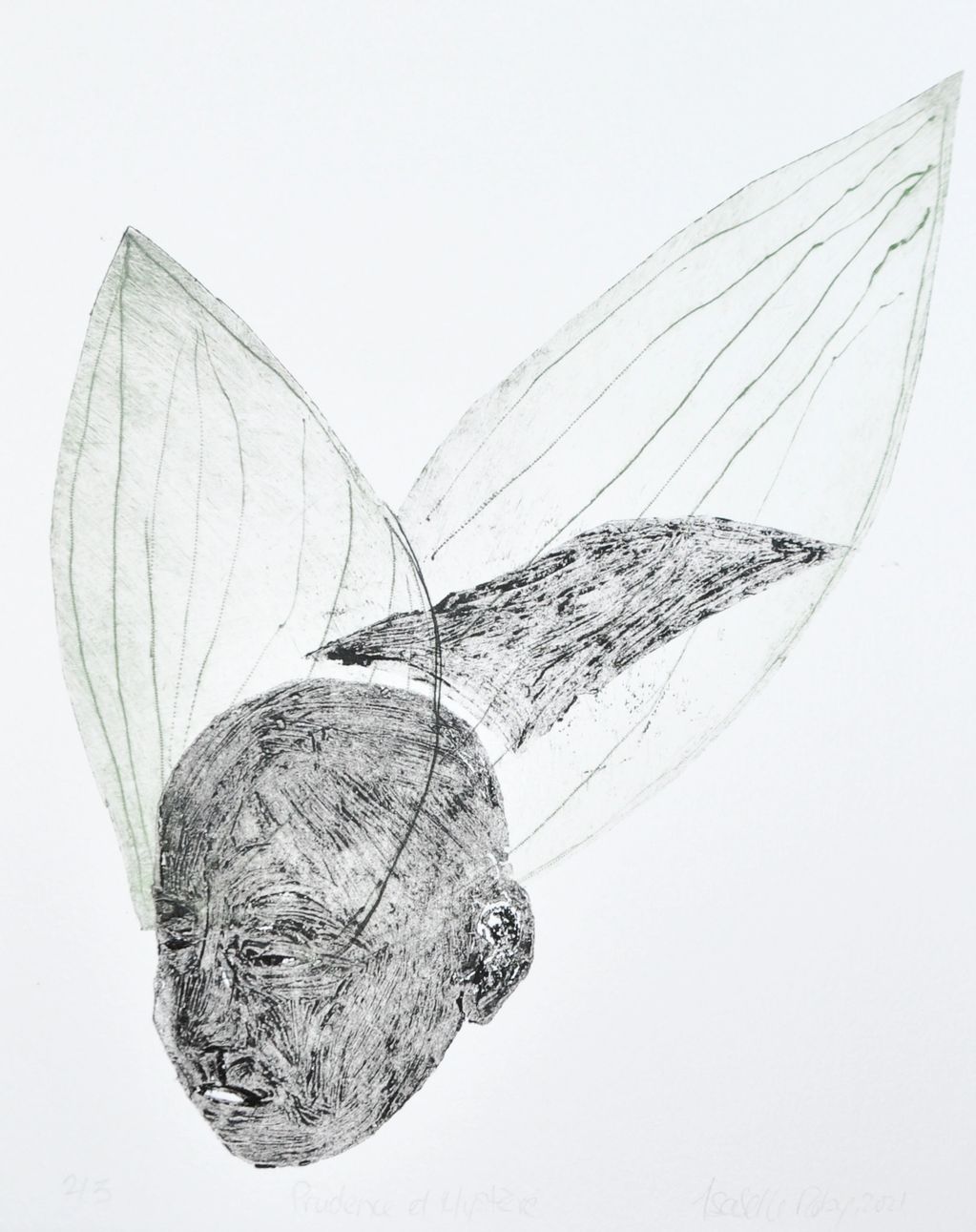 – Collagraphie et pointe sèche (30 × 40 cm, 2021). Inspirée de la légende de Mélusine, femme-serpent maudite, l’œuvre évoque sa dualité humaine et mythique. Deux matrices – collagraphie pour l’humain, gravure plexiglas pour le serpent – traduisent son hybridité.