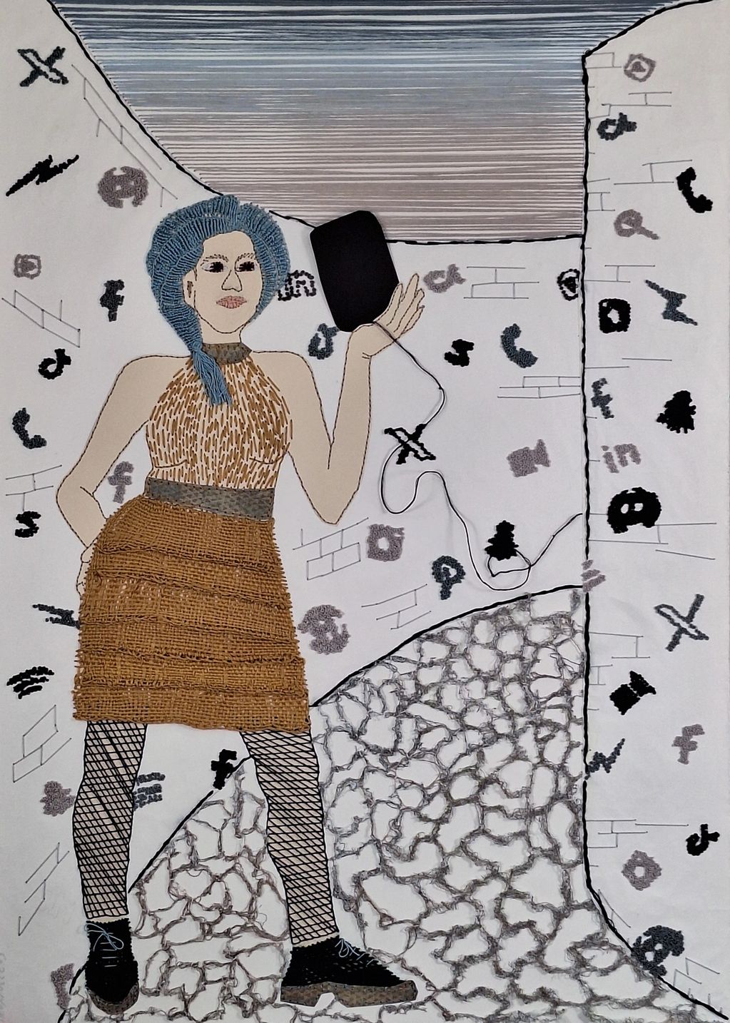 Ariadne – Hand and machine embroidery on Artistico paper (71 × 51 cm, 2023). At the gate of a digital labyrinth, she holds Theseus through social threads. This piece merg