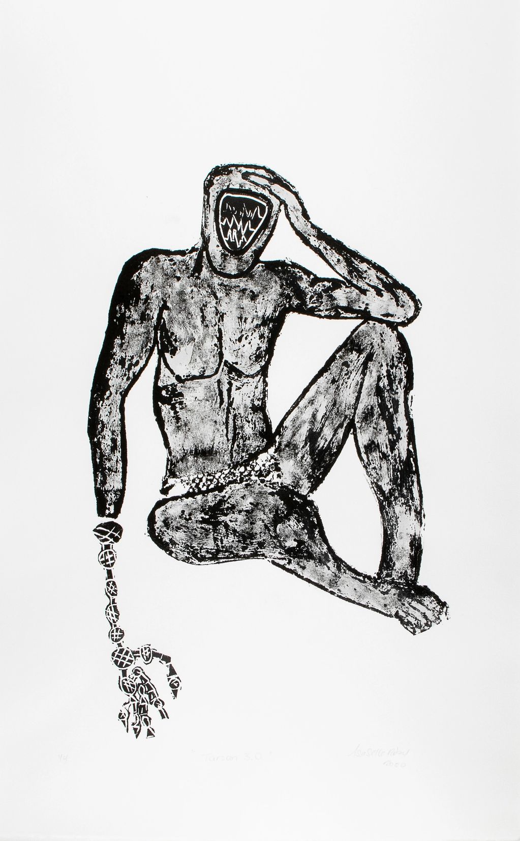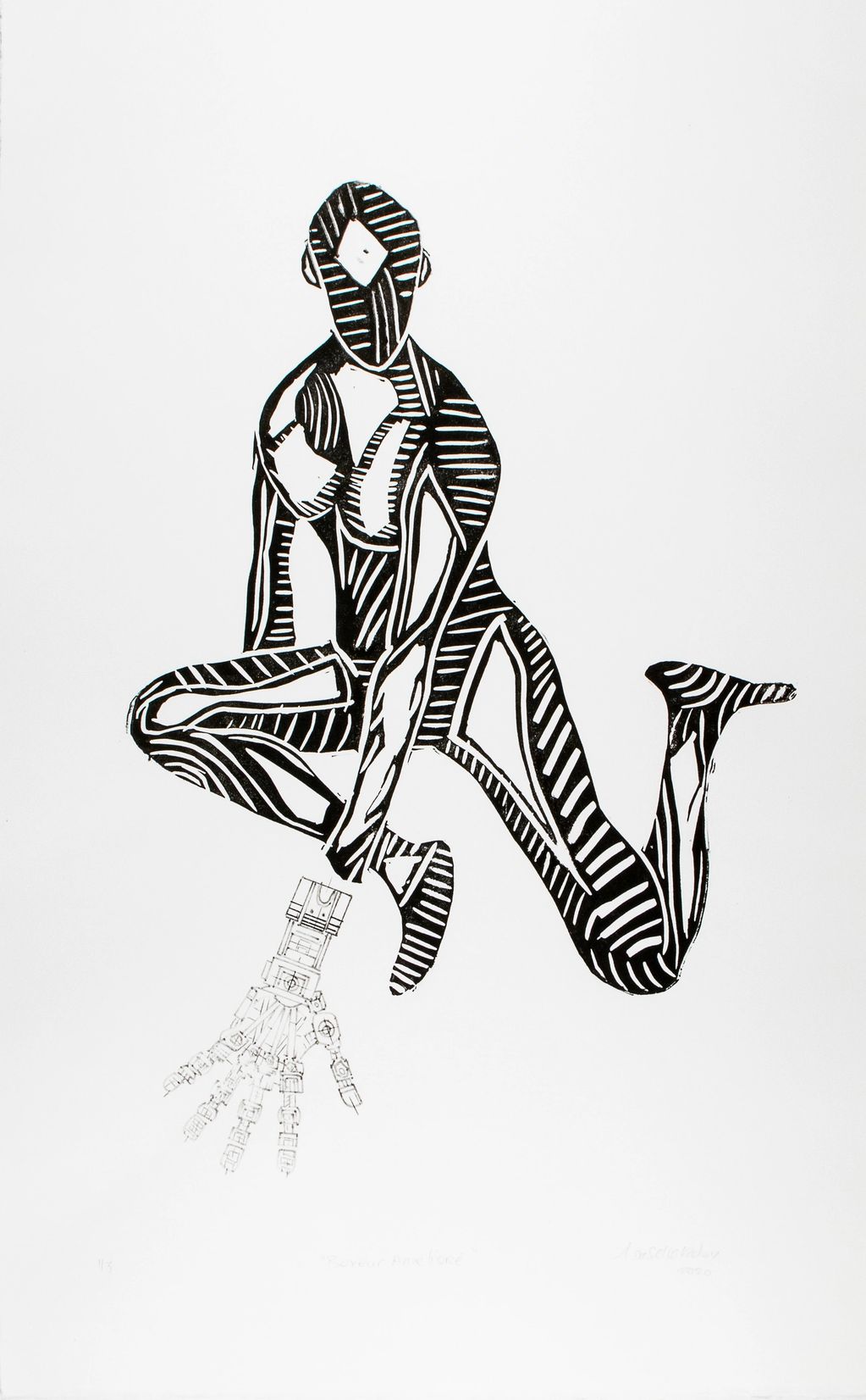 –This hybrid creature suggests a mechanized body, poised between fascination and unease. Both human and machine, it seems to sear
