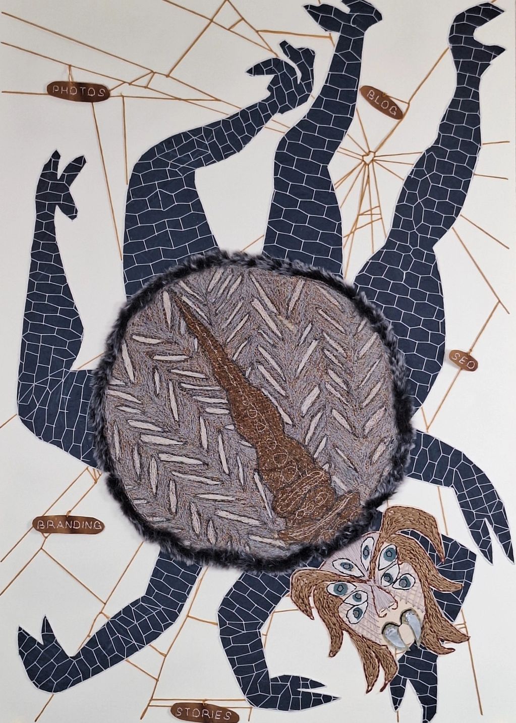 Arachne – Hand and machine embroidery on Artistico paper (71 × 51 cm, 2023). From Greek mythology, she spins her thread into a web, symbol