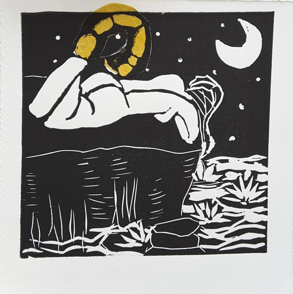 – Collagraph and drypoint (30 × 40 cm, 2021). Inspired by the Melusine legend, a cursed serpent-woman, the work reveals her