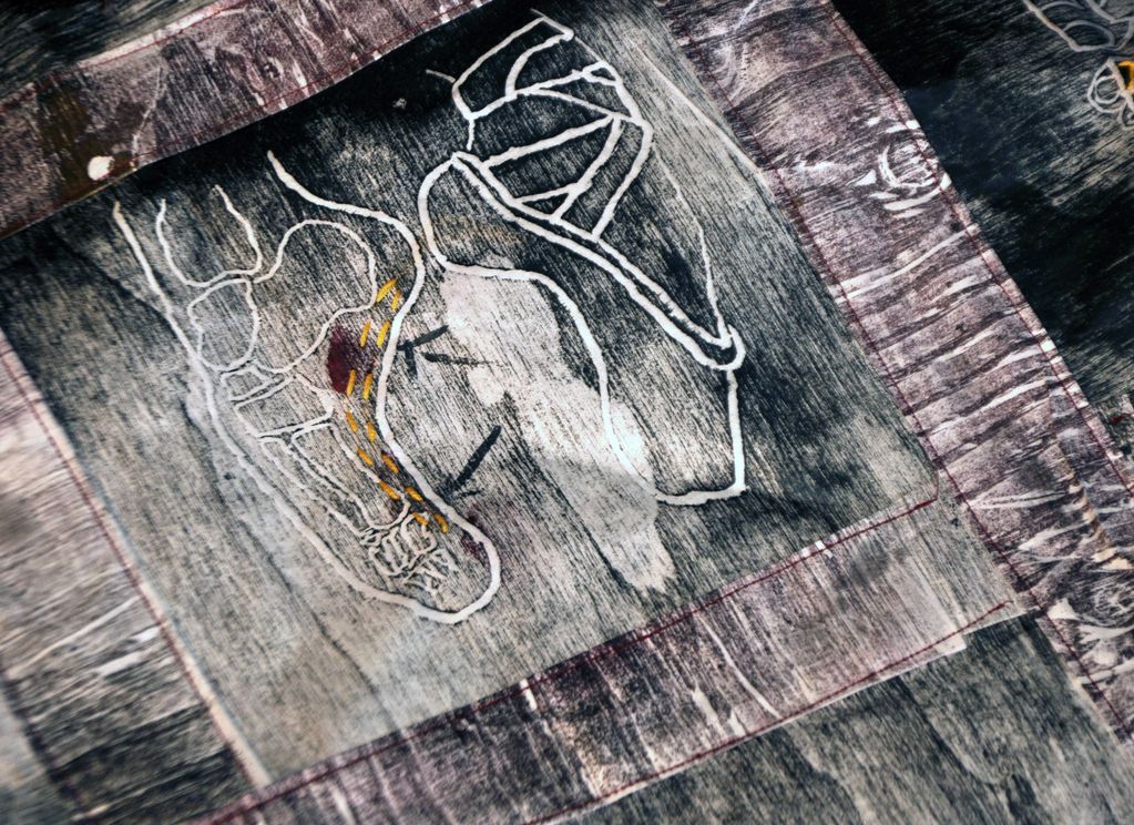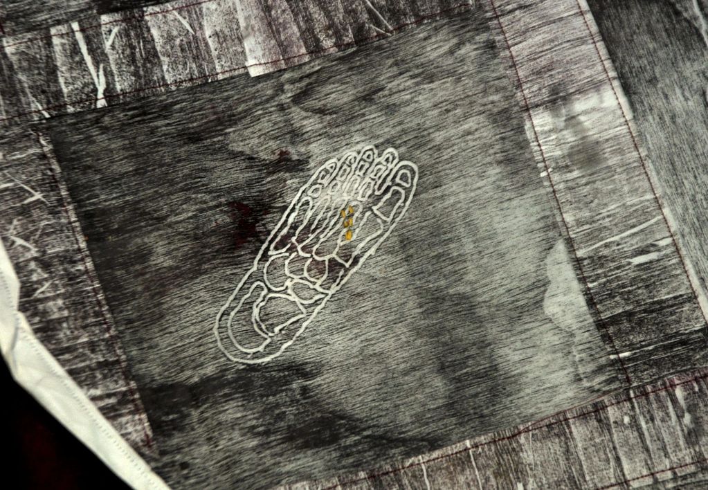 Imprint of an injured foot, between pain and beauty. The thread becomes a scar — the trace of steps toward an imposed ideal.