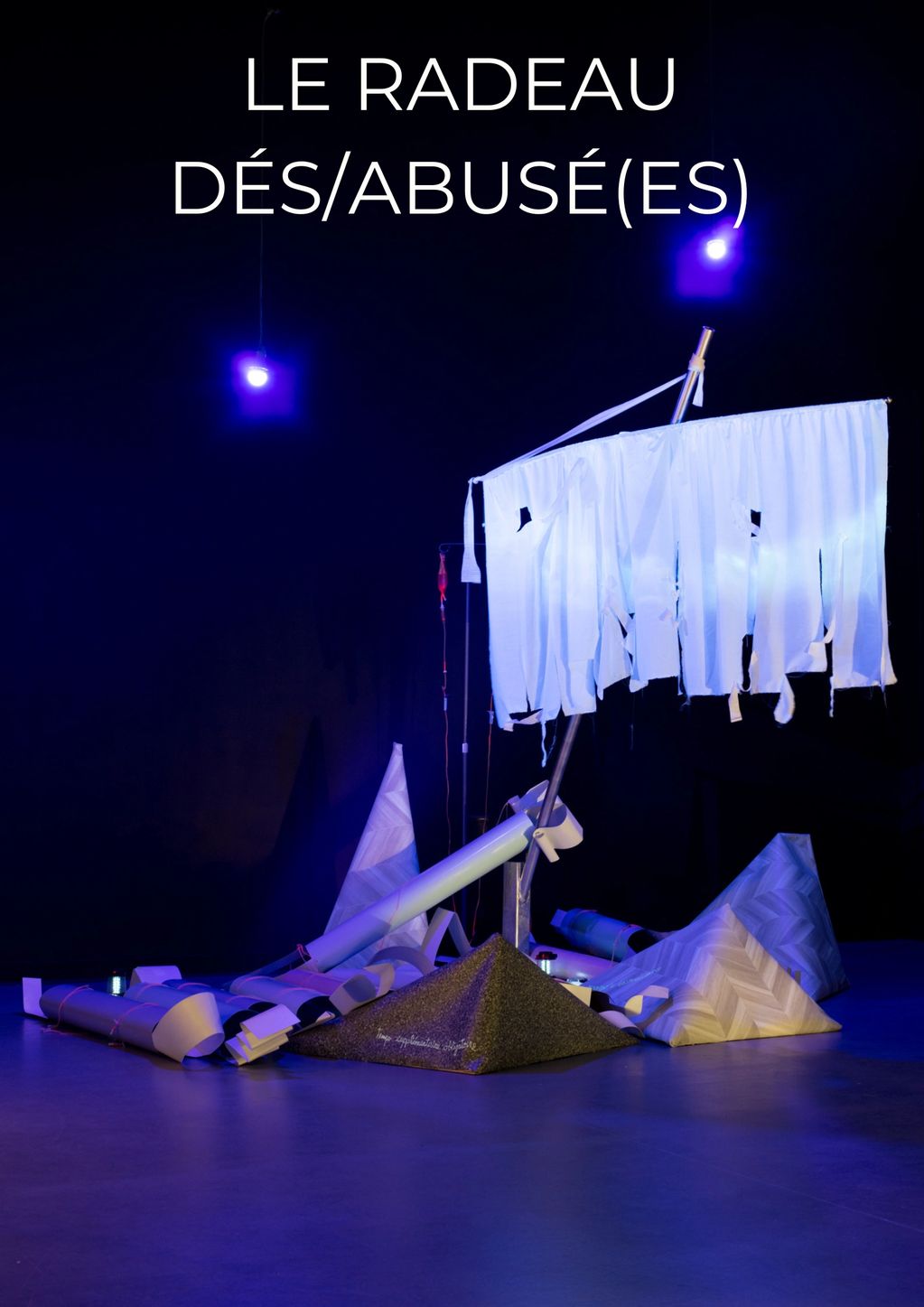 L’installation évoque le naufrage du système de santé. Le titre joue sur les mots désabusé et abusé, entre désillusion et épuisement subi. Sous la lumière noire, tubulures, roches et corps symboliques forment une métaphore de la dérive et du dévouement humain.
