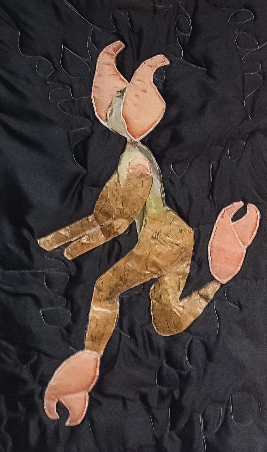 – Cette créature hybride évoque un corps mécanisé oscillant entre fascination et inquiétude. À la fois humain et machine, l’être semble chercher son identité dans la mutation du vivant.